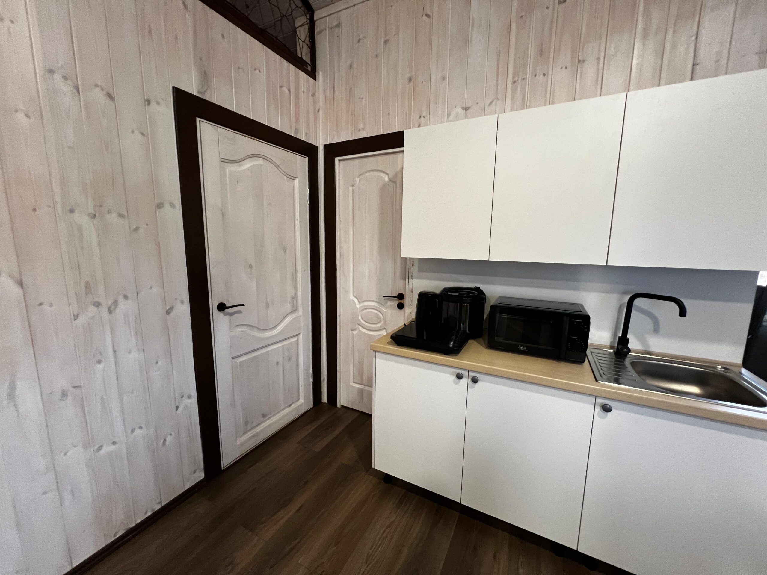 Небольшой уютный домик для двух человек. Коттедж состоит из комнаты, отдельной кухни, оборудованной всем необходимым инвентарем (охлаждающий минибар, микроволновая печь, плита, электрочайник, набор посуды). В комнате стандартный набор мебели, TV. Удобства в коттедже: WC, душевая кабина.