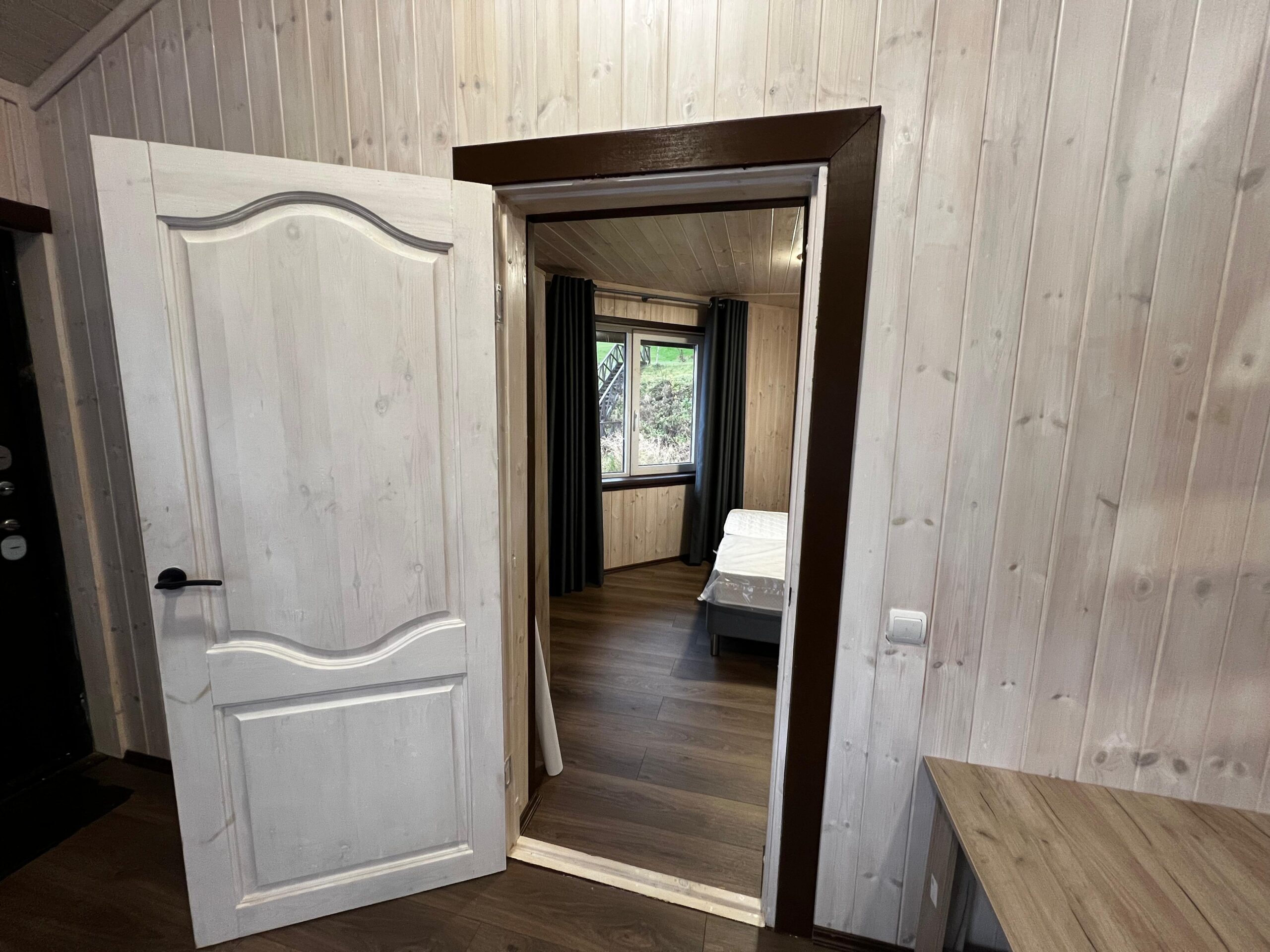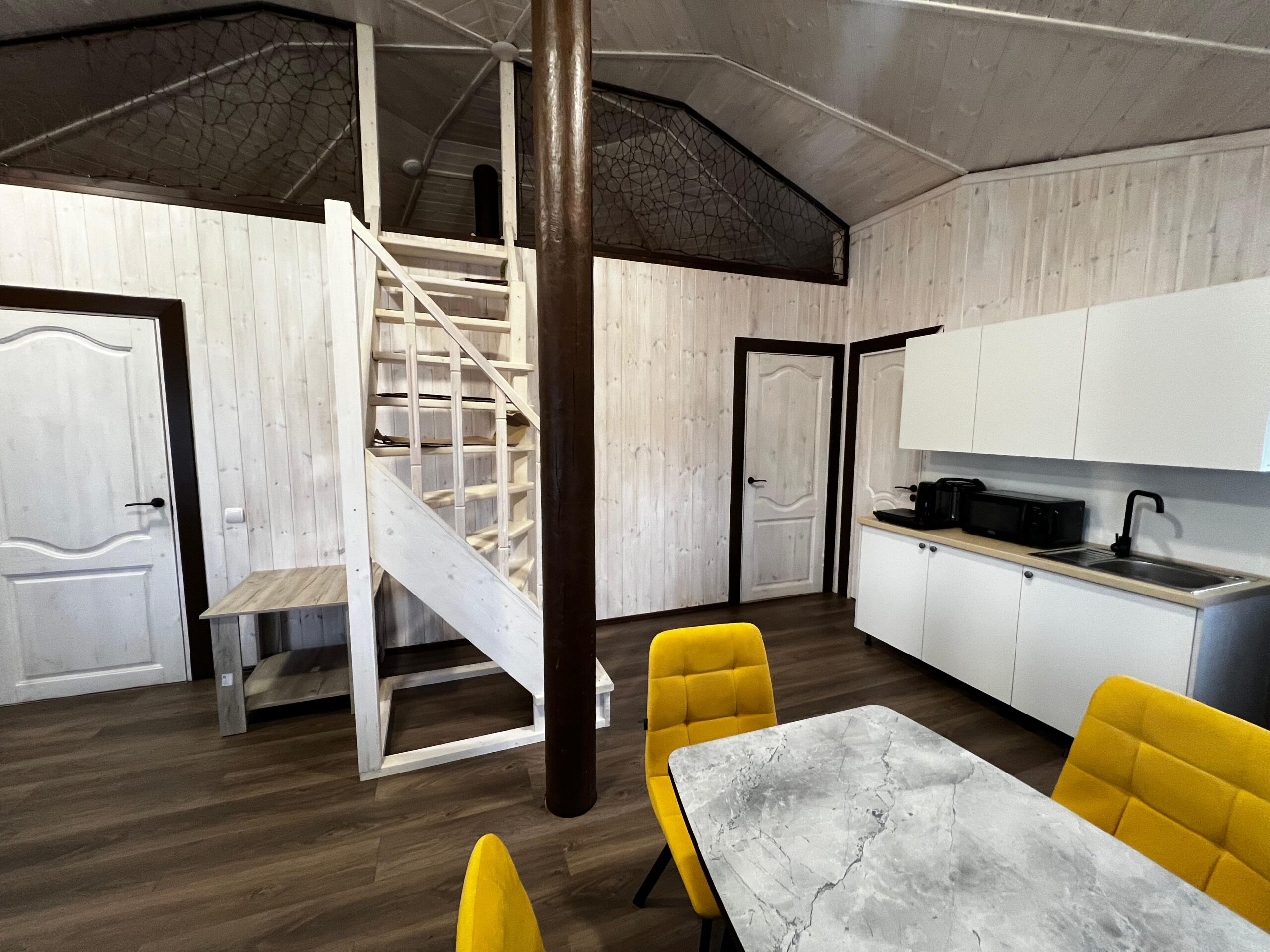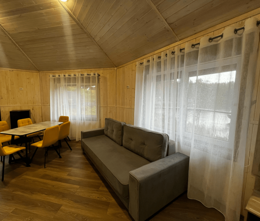 Коттеджи №4,5,6,7 расположены на самом берегу залива, четырехместные, есть возможность дополнительного места. Во всех коттеджах: кухня (охлаждающий минибар, микроволновая печь, плита, электрочайник, набор посуды), обеденная зона, просторный холл с камином и выходом на крытую веранду, стандартный набор мебели, телевизор.