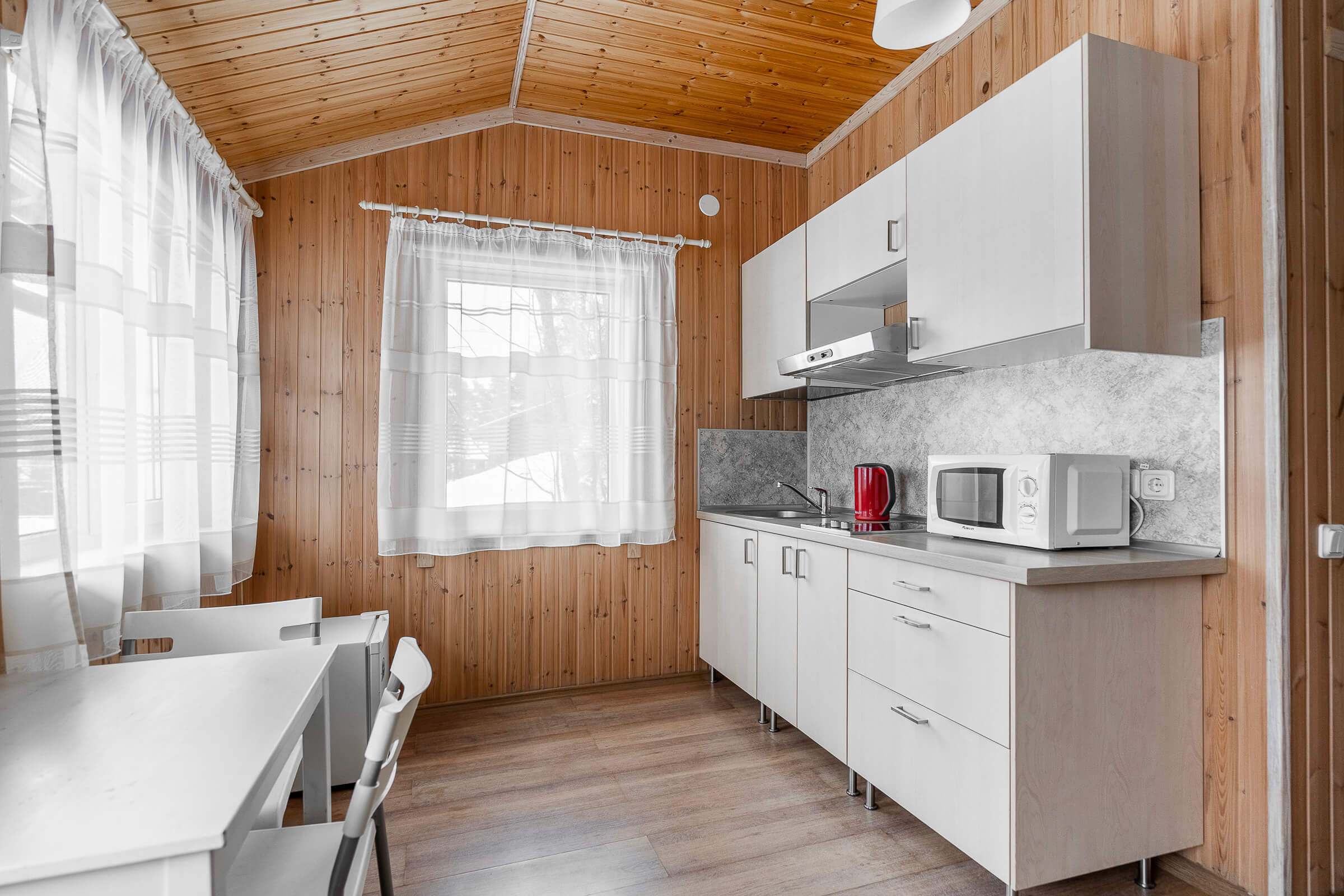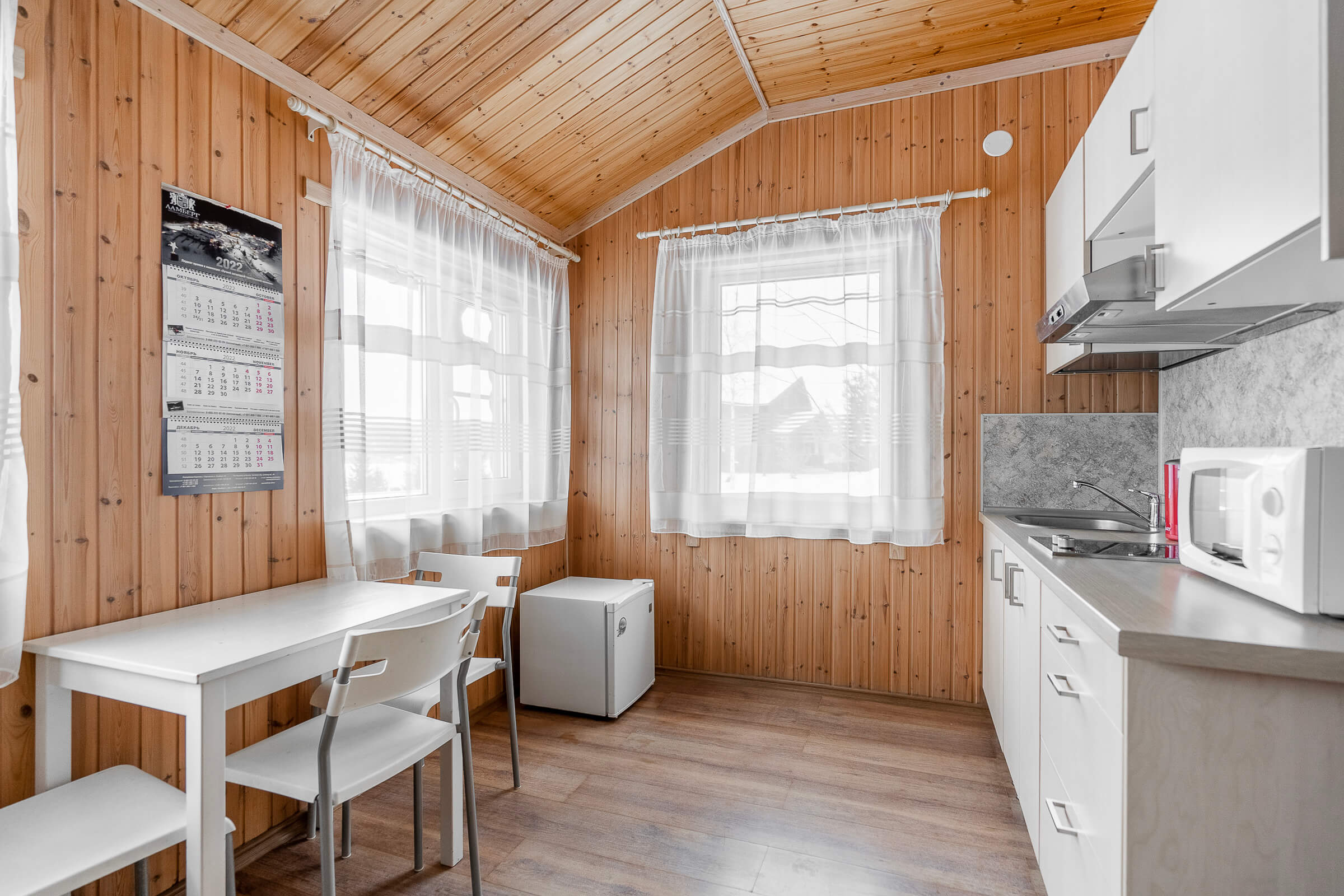 Коттедж состоит из комнаты, отдельной кухни, оборудованной всем необходимым инвентарем (охлаждающий минибар, микроволновая печь, плита, электрочайник, набор посуды).
